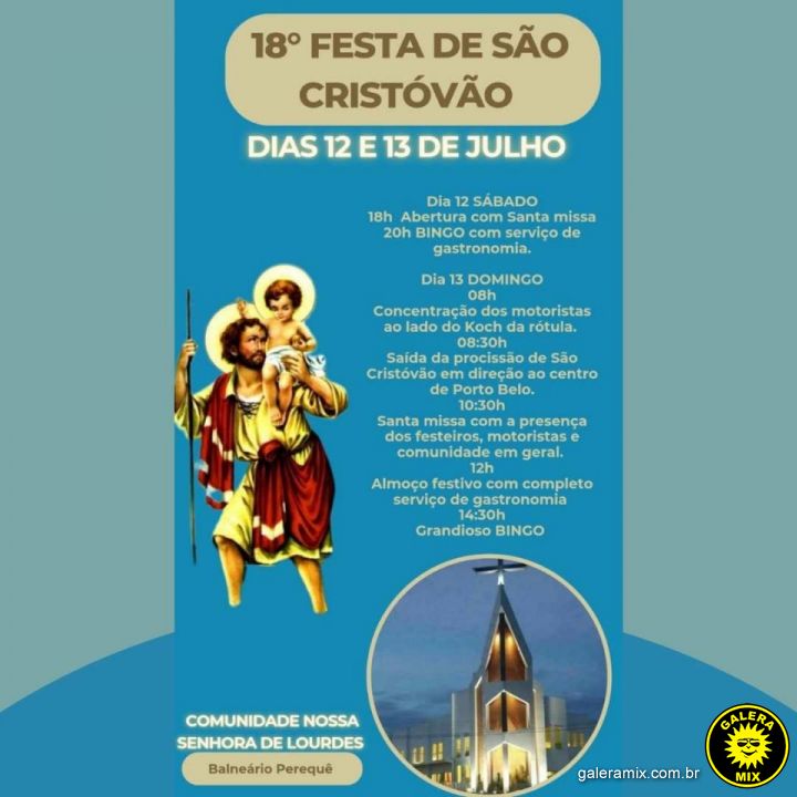 18ª Festa de São Cristóvão no bairro Perequê em Porto Belo. Dias 12 e 13 de julho.