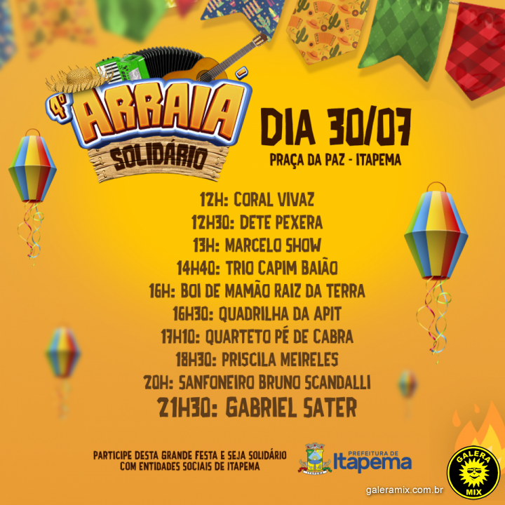 Faltam cinco dias para o 4º Arraiá Solidário de Itapema e nesta segunda-feira (25/07) foi divulgada a programação cultural completa da festa que promete movimentar a Praça da Paz no próximo sábado (30/07). No palco muitas apresentações vão animar o público a partir das 12h.