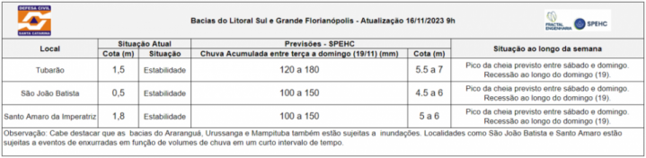 Ainda de acordo com a Defesa Civil, São João Batista está sujeita a eventos de enxurradas em razão de volumes de chuva em curto intervalo de tempo.