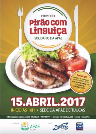 A Apae (Associação de Pais e Amigos ) de Tijucas, convida atoda a comunidade da região para o 1º Pirão com Linguiça Solidário. O evento será realizado na sede da entidade, localizada na Av. Hercílio Luz, n° 18, no Centro de Tijucas, neste sábado, dia 15 de abril, com início às 10 horas e almoço servido ao meio dia. Também terão apresentações folclóricas, música, dança e muita diversão.
