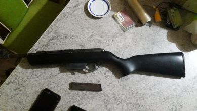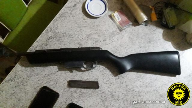 Autorizados a entrar na casa pelo proprietário os agentes localizaram uma espingarda calibre .22 com cinco munições. No local ainda estavam o outro filho de V.S.F. identificado como M.S.F. de 21 anos e sua amiga E.C.S.P. sendo que nenhum dos três soube dizer a procedência da arma.