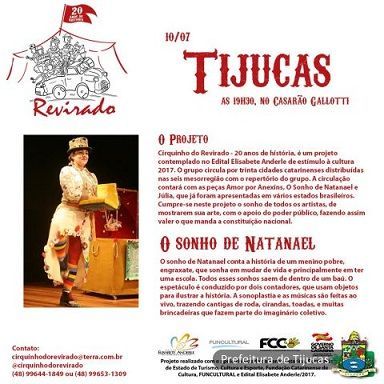 A peça “O Sonho de Natanael”, que já foi apresentada em vários estados brasileiros, chega à capital do Vale do Rio Tijucas. De acordo com Paula Regina da Silva, secretária Municipal de Cultura, o espetáculo conta com o apoio do poder público, através do Edital Elisabete Anderle de estímulo à cultura 2017, entre outros órgãos estaduais.