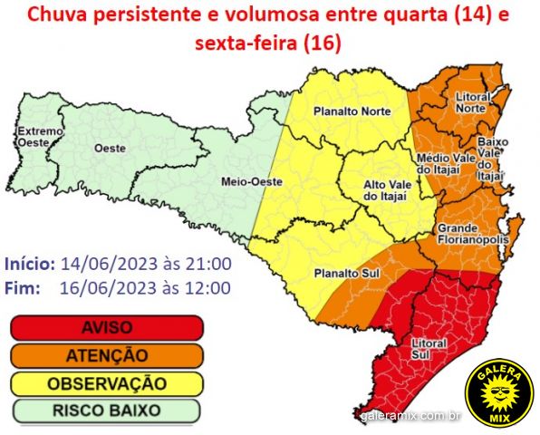 Conforme o órgão, a preocupação é para às próximas horas, onde são esperados acumulados em torno de 40 mm de chuva no Litoral Norte. Nas regiões da Grande Florianópolis e Litoral Sul também são esperados um grande volume de chuva, principalmente na madrugada desta sexta-feira (16). São esperados até 150 mm nesses locais. As regiões Litoral Sul (faixa vermelha do mapa) e Grande Florianópolis (faixa laranja no mapa), são as regiões com maiores riscos para ocorrências meteorológicas.
