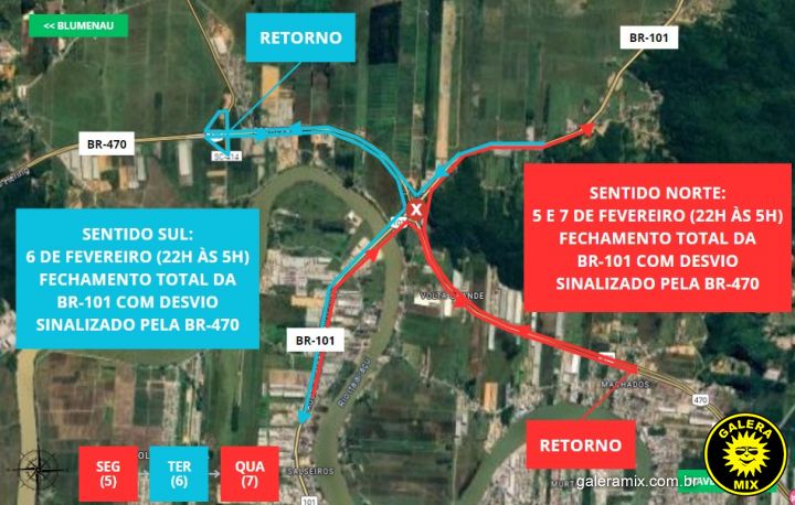 - TERÇA-FEIRA (6 de fevereiro, 22h às 5h): Bloqueio no sentido SUL, com desvio pela BR-470/SC e retorno no viaduto de acesso a Luiz Alves.