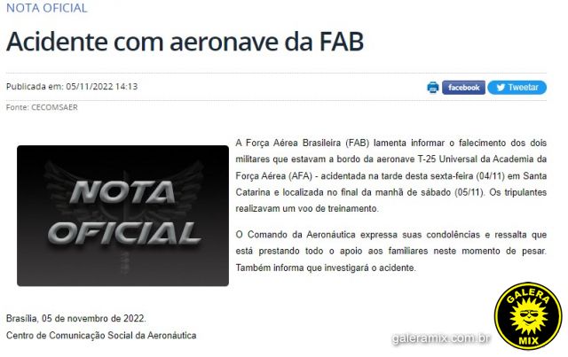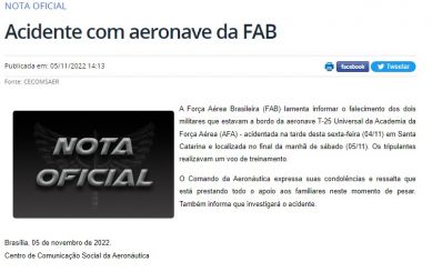 Os canais de comunicação das Forças Aéreas Brasileiras emitiram uma nota oficial sobre o falecimento dos tripulantes da aeronave T-25. Confira na íntegra: