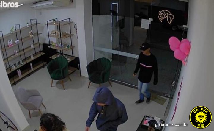A ação foi registrada pela câmera de monitoramento. A dupla entra no salão por volta de 18h09. Em menos de 40 segundos, eles renderam as mulheres e roubaram os dois celulares das vítimas, uma caixa de som JBL e uma aliança de ouro. A dupla fugiu à pé, segundo relatos.