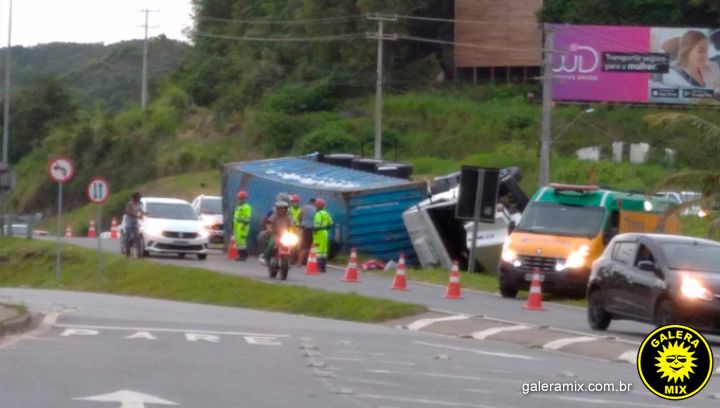 O trânsito ficou complicado no fim da tarde desta terça-feira (28), na BR-101, depois que um caminhão, carregado com um container, tombou logo após o posto da PRF (Polícia Rodoviária Federal), em Itapema. O acidente aconteceu por volta das 18h, na entrada de acesso do Bairro Ilhota, às margens da pista, no sentido norte.
