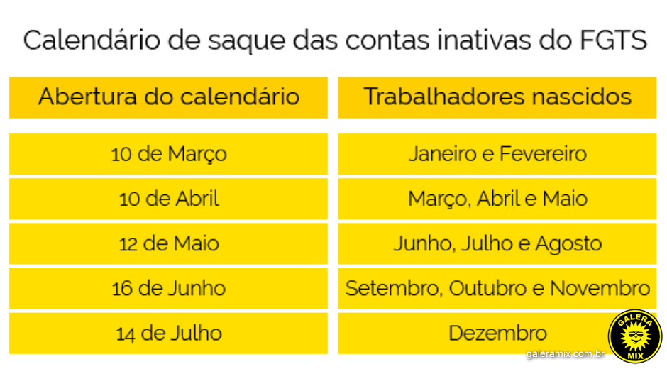 Quem nasceu em março, abril e maio vai sacar entre 10 de abril e 11 de maio. Trabalhadores nascidos nos meses de junho, julho e agosto vão sacar entre os dias 12 de maio e 15 de junho. Nascidos em setembro, outubro e novembro vão receber os valores em entre 16 de junho e 13 de julho. Os trabalhadores nascidos em dezembro vão fazer o saque entre os dias 14 e 31 de julho.