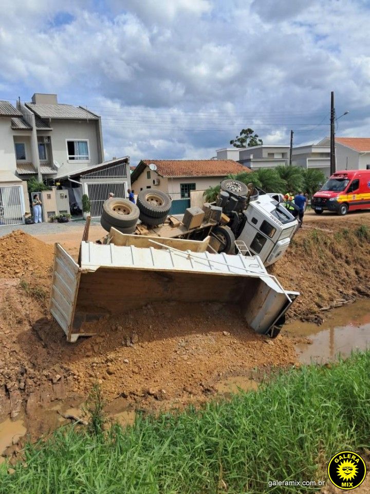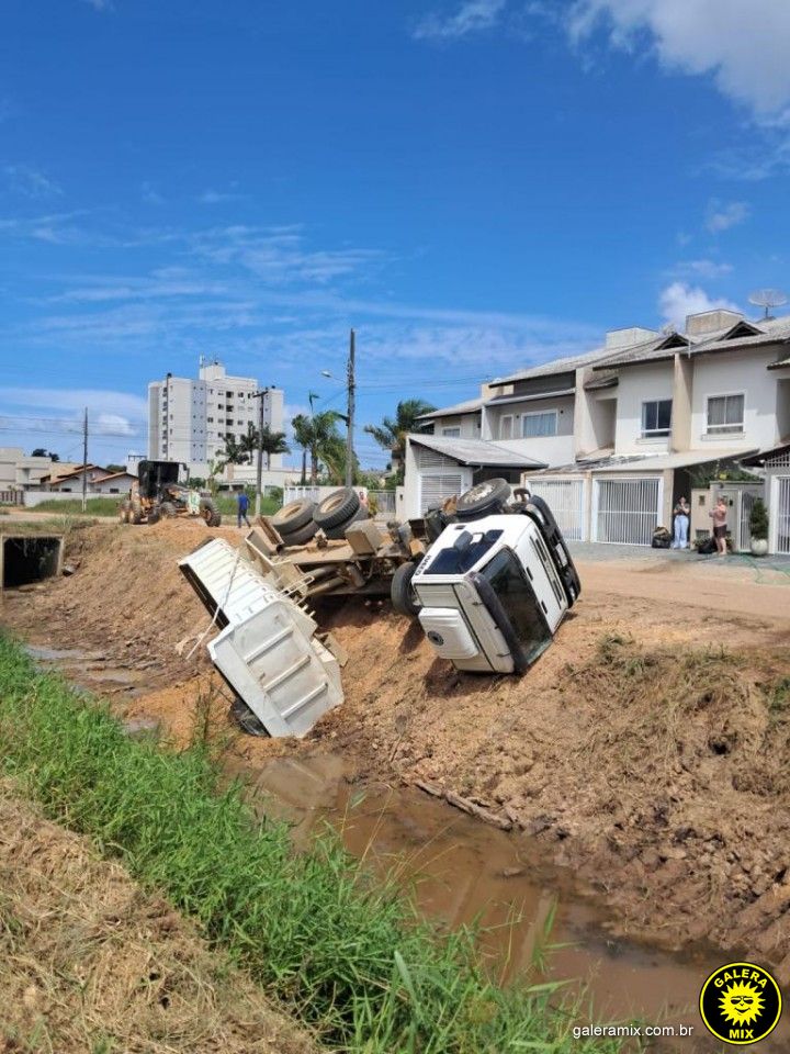Um caminhão caçamba pertencente à Prefeitura de Canelinha tombou em uma vala na tarde desta terça-feira, 17 de março, no Centro do município. O acidente ocorreu por volta das 13h39, na Rua Manoel Francisco Corrêa, nas proximidades do quartel do 13º Batalhão de Bombeiros Militar.