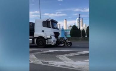 Uma cena impactante foi flagrada na BR-101 em Balneário Camboriú neste sábado (06). Motoristas filmaram um caminhão arrastando uma moto em grudada ao para-choque em alta velocidade. Além disso, o motociclista aparece agarrado à porta do motorista do caminhão.