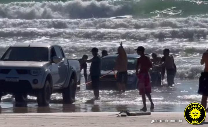 Nas imagens, o veículo aparece com os pneus submersos, enquanto um grupo de homens tenta removê-lo usando outro carro e um cabo de tração. Após duas horas de esforços, a caminhonete foi retirada da água. A presença de uma moto aquática ao lado sugere que o motorista tentava colocá-la no mar quando ficou preso, embora o local tenha placas proibindo a entrada de veículos na praia.