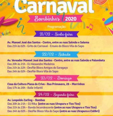 O Carnaval Bombinhas 2020 terá muita música e animação com show de banda, DJ’s locais e desfile dos Blocos Vila do Sapo e Amigos do Saragaço. Para as crianças, a festa também está garantida com o Baile Infantil. Todos os eventos oficiais e organizados pela Prefeitura são abertos e gratuitos e acontecem em Bombas, Centro e Morrinhos.