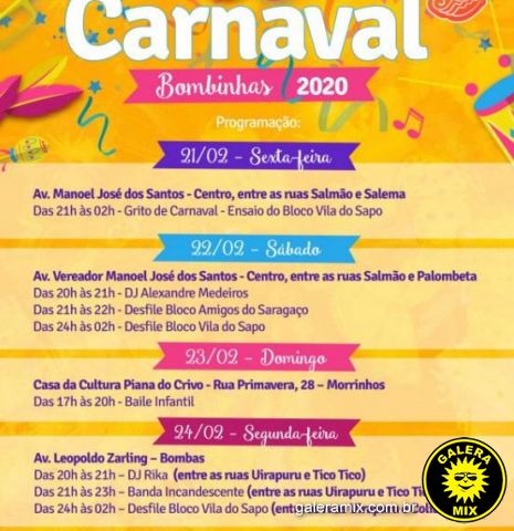 A programação inicia na sexta-feira, 21 de fevereiro, às 21h com o som do DJ Fernando Salvan. Às 23h, o Grito de Carnaval – Ensaio do Bloco Vila do Sapo toma conta da Av. Vereador Manoel José dos Santos. No sábado, 22, também no Centro, o DJ Alexandre Medeiros comanda a noite com muita música e animação no trio elétrico, a partir das 20h. Por volta da 21h, inicia o desfile dos Amigos do Saragaço, e à meia-noite o desfile da Vila do Sapo.