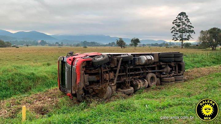 Uma carreta carregada com 16 toneladas de carne tombou na madrugada desta sexta-feira (09) na BR-101, em Tijucas. O acidente ocorreu por volta da 1h30min, no Km 159 da rodovia, no sentido sul.