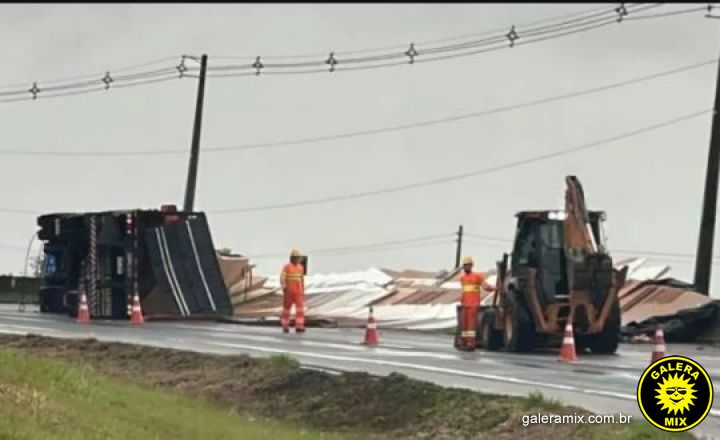 Carreta com MDF tomba na BR-101 em Biguaçu
