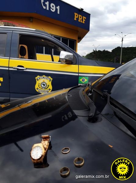 Segundo a vítima, ao sair de uma lotérica, o casal teria usado violência para roubar seu anel de ouro, relógio e um par de brincos. Em seguida, eles fugiram em um VW/Gol placas de Canoas/RS. A PRF localizou e abordou o veículo suspeito por volta das 10h30, no km 143 da rodovia.