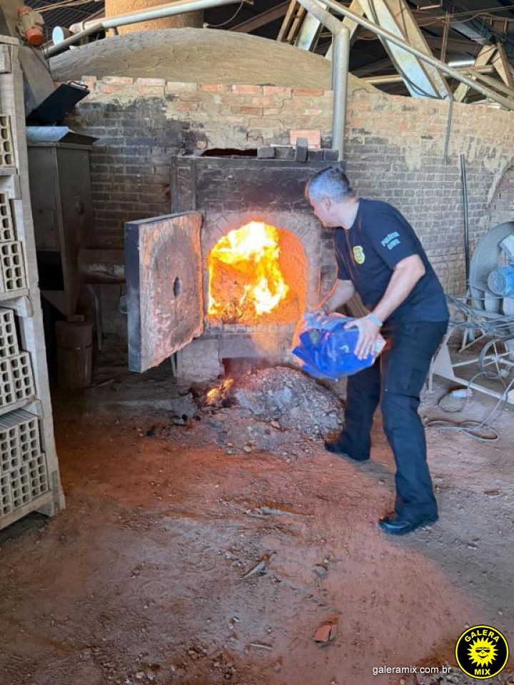 A queima do material ocorreu em uma empresa especializada no município de Canelinha, com acompanhamento de autoridades policiais e representantes de órgãos de fiscalização, conforme exigem os protocolos legais e ambientais.