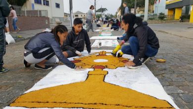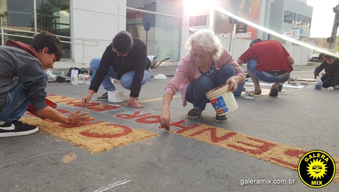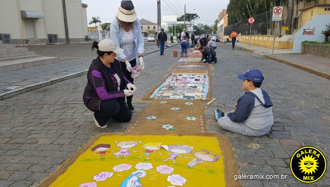 Por volta das 6h da manhã desta quinta-feira, 20 de junho, feriado de Corpus Christi, muita gente levantou cedo para realizar a tradicional confecção dos tapetes. Pessoas de várias as idades ajudaram a colorir as ruas das proximidades da igreja matriz São Sebastião, no centro de Tijucas.