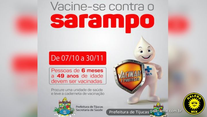 Começou nesta segunda-feira (07) uma campanha nacional de vacinação com o objetivo de garantir, até o dia 25 de outubro, que pelo menos 95% de todos os bebês e crianças entre seis meses e 4 anos 11 meses e 29 dias de idade recebam uma dose da vacina contra o sarampo. O “Dia D” da campanha acontece dia 19 de outubro. Para Jovens de 20 a 29 anos que não tomaram duas doses da vacina, o período será de 18 a 30 de novembro.