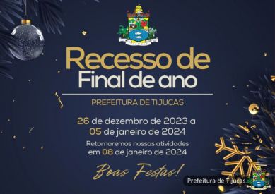 Conforme Decreto Nº 2.230/2023, a Prefeitura Municipal de Tijucas não terá expediente entre os dias 26 de dezembro de 2023 e 05 de janeiro de 2024, com retorno ao atendimento normal no dia 08, devido ao recesso de fim de ano.