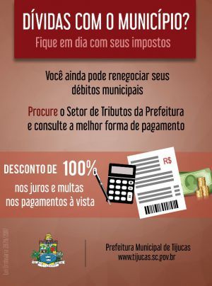 O prefeito de Tijucas, professor Eloi Mariano Rocha convida os contribuintes a aderirem ao programa. “Estabelecemos novas regras para o refinanciamento de impostos e esperamos que, com isso, todos tenham oportunidade de ficar em dia com os tributos municipais e assim, colaborar com a administração para realização de novas obras”, conclui.