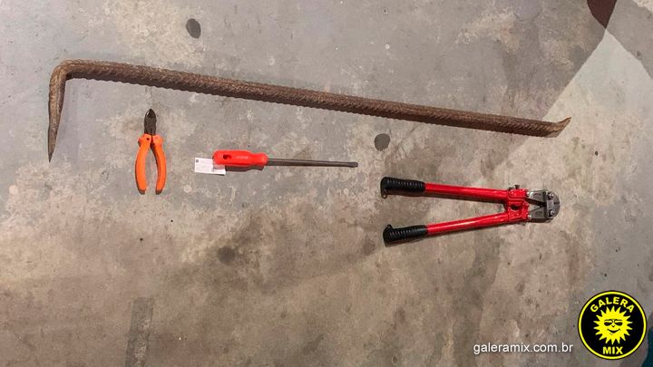 Dentro do automóvel, os policiais encontraram os materiais usados no crime, sendo um corta fio, duas chaves de fenda, barra de ferro, alicate e uma parafusadeira. Além disso, foram localizados os cadeados da porta do açougue, ambos cortados na ação.