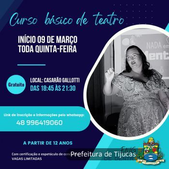 A companhia de Artes de Tijucas torna público, nesta quarta-feira (25), a abertura de vagas para o curso básico de teatro. A capacitação - totalmente gratuita - terá início no dia 09 de março, acontecendo de forma presencial às quintas-feiras, no Casarão Gallotti, das 18h45 às 21h30.