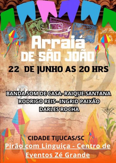 No sábado, 22 de junho,, áss 8 horas da noite, acontece no parque do Pirão com Linguiça, o Centro de Evento Zé Grande, no bairro Praça em Tijucas, a Festa de São João.