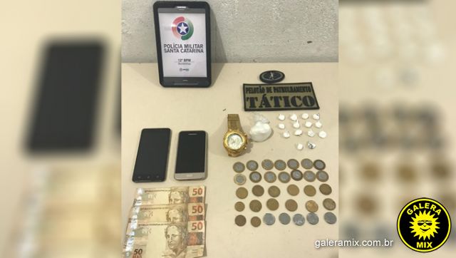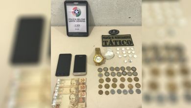 Além de diversas buchas de entorpecentes, as autoridades policiais reuniram também um relógio, dois celulares, R$150,00 em espécie – além de moedas.