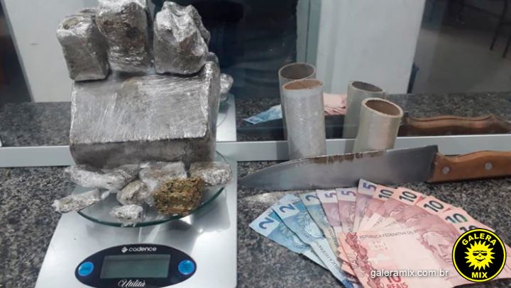 Em buscas pelo imóvel, a guarnição localizou um torrão grande de maconha sobre uma mesa, junto com uma faca que estava sendo utilizada para fracionar a droga, uma balança de precisão e R$ 71 em notas trocadas.