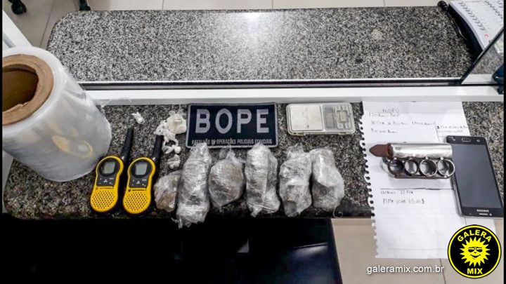 Jhonatas Viana Mormou, de 19 anos, foi abordado na rua e teria resistido à prisão. Em sua posse nada foi encontrado, porém em sua residência a PM achou 300g de maconha, 20g de cocaína, dois rádios comunicadores, balança de precisão, aparelho celular, duas cápsulas de revólver calibre 32, dois "socos inglês", um caderno com anotações, faca e rolo plástico.