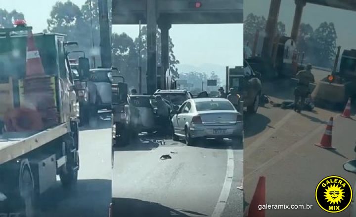 O acidente ocorreu por volta das 14h30 deste domingo, já próximo à cabine de cobrança do pedágio. Vídeos feitos por motoristas que passam pelo local mostram os carros batidos e até um motociclista caído no chão. Há trânsito intenso no local.