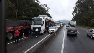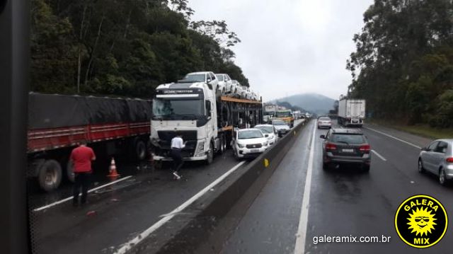 Um engavetamento no km 128 bloqueou a BR-101 sentido Sul na cidade de Itajaí na tarde desta quarta-feira (19). Segundo a Polícia Rodoviária Federal (PRF) o engavetamento envolveu cerca de 10 veículos, dentre eles um caminhão.
