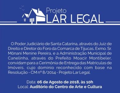 Na próxima segunda-feira, 06 de agosto, o Poder Judiciário de Santa Catarina, através do Juiz de Direito e Diretor do Foro da Comarca de Tijucas, Exmo. Sr. Mônani Menine Pereira, e a Administração Municipal de Canelinha, através do Prefeito Moacir Montibeler, entregarão 47 escrituras públicas para famílias do município por meio do Projeto Lar Legal.