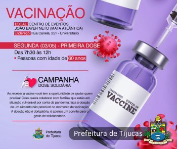 Dando sequência ao cronograma de primeira dose, Tijucas fará a imunização de pessoas com 60 anos na próxima segunda-feira (03) com a chegada de novas doses da vacina AstraZeneca. A vacinação será feita no Centro de Eventos Dr. João Bayer Neto, no loteamento Mata Atlântica, das 7h30 às 12h.