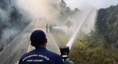 Um incêndio em vegetação mobilizou diversos bombeiros na tarde desta terça-feira (26), na SC-410, entre Brusque e Nova Trento. Por conta da ocorrência, a rodovia precisou ser interditada. Equipes do Arcanjo 01 estão auxiliando no combate. Além deles, há guarnições de Guabiruba e Gaspar auxiliando nos trabalhos. O fogo está localizado em três pontos da mata.