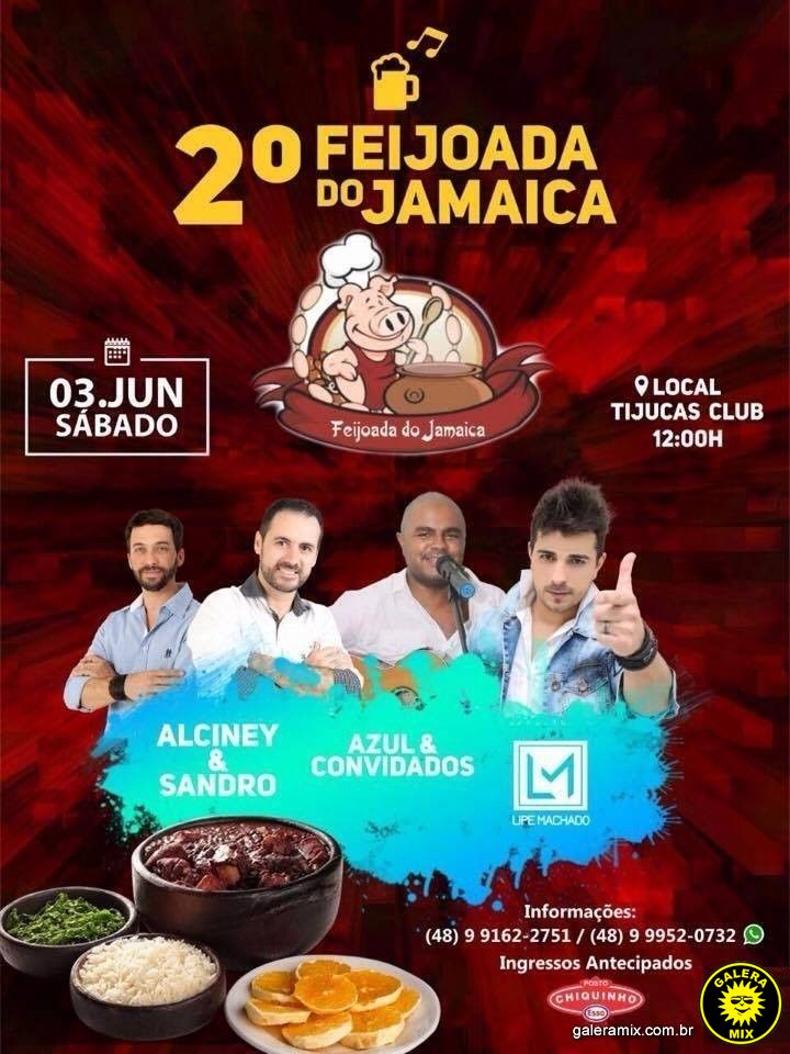 A Feijoada 2017 do Jamaica terá no palco Alcinei e Sandro, Azul e Convidados e Lipe Machado e banda. Isso quer dizer que o evento tem hora pra começar, mas não para acabar.