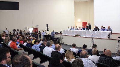 Em evento oficial na tarde desta quinta-feira (26), para assinatura do termo de adesão ao Badesc Cidades, o prefeito de Tijucas Eloi Mariano Rocha recebeu o governador do Estado de Santa Catarina, João Raimundo Colombo. Com o auditório do anfiteatro Leda Regina de Souza repleto, o prefeito agradeceu a vinda do governador e aproveitou a ocasião para pedir ao governador respostas para quatro questionamentos do município.