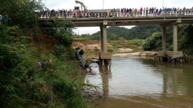 O fato ocorreu em cima da ponte que corta o rio e antes de cair na água o carro ainda arrebentou o corrimão da ponte.