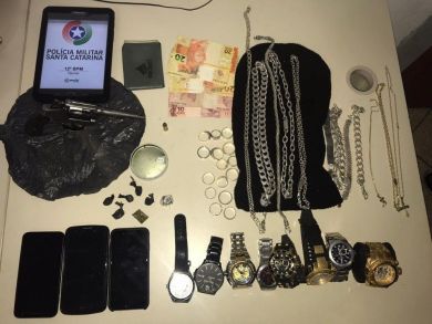 Com o auxílio da guarnição de área foi adentrado a residência e efetuado varredura. Escondidos em um fundo falso no armário do quarto de Tiago foram encontrados diversos produtos de origem duvidosa entre eles, 01 revólver calibre .32 com uma munição intacta do mesmo calibre, uma toca bala clava, 08 relógios, 03 celulares, joias e dinheiro.