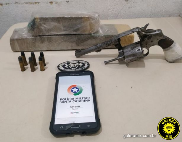 Em revista aos dois que ficaram no local os policiais encontraram, na cintura de um deles, de 24 anos, um revólver calibre 38, com seis munições intactas. Dentro do veículo, embaixo do banco do passageiro, havia uma sacola e nela, um tablete e meio de substância semelhante a maconha, totalizando 2 kg da droga.