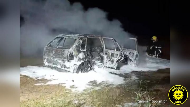 O cenário do incidente, onde um veículo pegou fogo, ficando completamente destruído apesar da rápida ação dos bombeiros militares e da Polícia Militar.