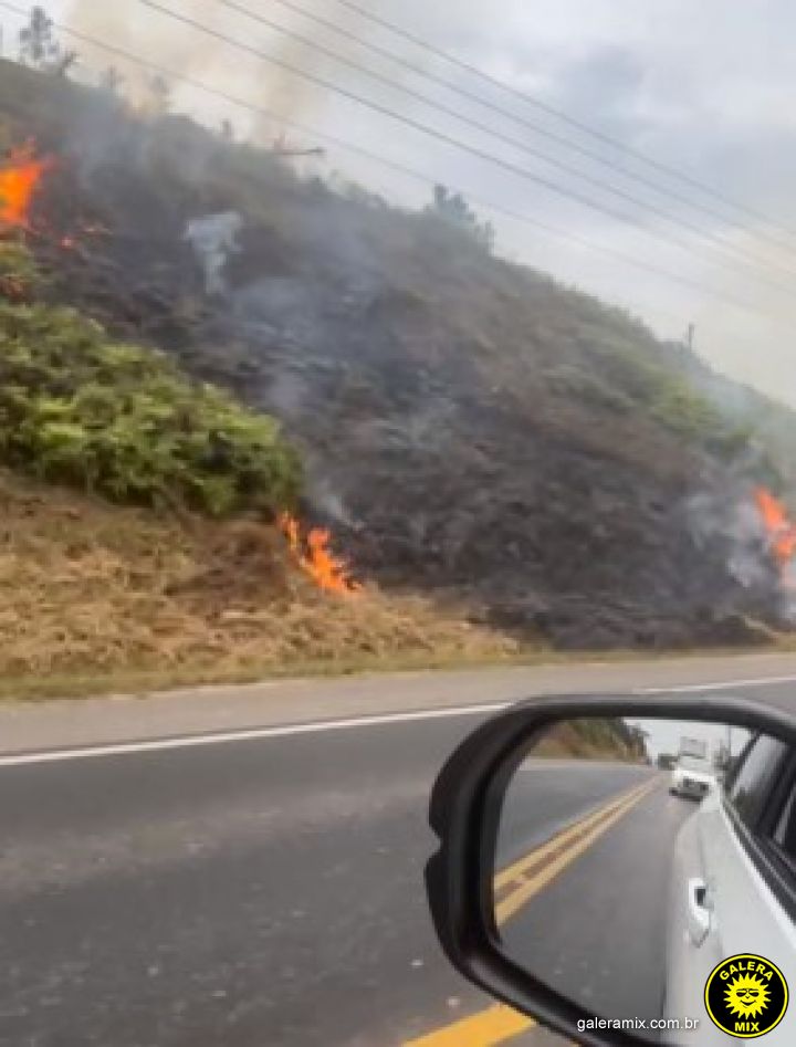 Na tarde desta sexta-feira (07/07), um incêndio de grandes proporções atingiu a vegetação próxima à rodovia no sentido São João Batista. Carros que passavam pelo local registraram a situação em vídeos, evidenciando a intensidade das chamas e a fumaça densa que se espalhava pela região.