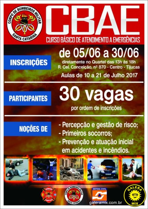 Foi lançado o edital para abertura de Curso Básico de Atendimento a Emergências (CBAE), para o município de Tijucas. As inscrições para o cursos serão realizadas até o dia 30 de junho. O curso será realizado no Quartel do Corpo de Bombeiros Militar.