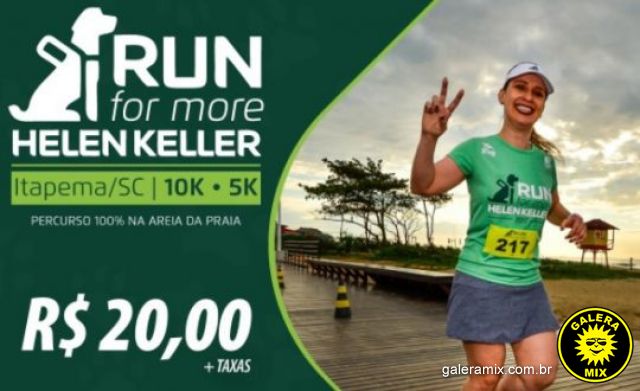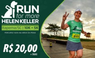 A Corrida RUN FOR MORE Helen Keller, compreende um evento esportivo em prol da Escola de Cães Guias Helen Keller e tem apoio da Prefeitura de Itapema, por meio da Secretaria de Turismo, Cultura, Esporte e Desenvolvimento Econômico. As provas acontecem no dia 05 de Setembro de 2021 com as modalidades de corrida de 5Km e 10Km na areia da praia respeitando todas as medidas de prevenção previstas na portaria publicada e vigente nº 620 da SES/FESPORTE.