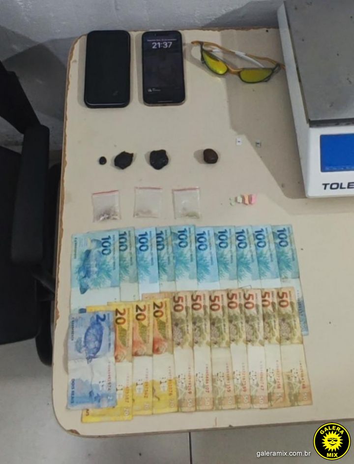 O homem recebeu voz de prisão e foi encaminhado à Delegacia de Polícia Civil. As drogas, o dinheiro, os objetos e o veículo foram apreendidos para os procedimentos legais.