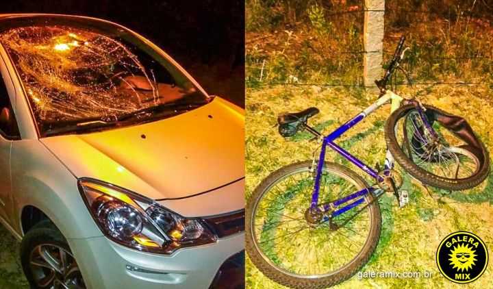 O condutor do automóvel, A.A., relatou que em uma curva da estrada uma bicicleta veio em alta velocidade na contra mão, ocasionando a colisão frontal.