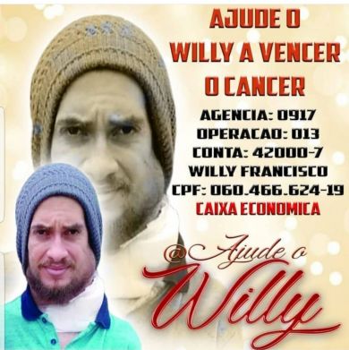 Estamos fazendo uma campanha para que o nosso amigo Willy possa concluir o tratamento contra um câncer raríssimo (Carcinoma de Nasofaringe Indiferenciado metastático), que infelizmente não tem tratamento pra esse tipo de câncer no Brasil, só no Hospital Chipsa, em Tijuana, no México. Com muito esforço, conseguimos através de pessoas comuns e de alguns artistas, o valor referente a 1 mês de tratamento e Willy iniciou o tratamento dele no dia 22 de julho. Estamos correndo contra o tempo para que esse tratamento nao seja interrompido por falta de recursos e por este motivo, estamos aqui pedindo ajuda em divulgação, para que possamos alcançar juntos a vitória e salvar essa vida. Gostaríamos que a campanha de Willy, seja extremamente divulgada, pois qualquer ajuda que venha a somar na campanha, será muito bem vinda. O valor mensal do tratamento é de 85 mil reais. Infelizmente, o prazo para conseguirmos o valor do próximo mês está expirando daqui a 3 dias e por este motivo, estamos pedindo a ajuda de vocês, para divulgarmos o quanto antes. Conseguimos até agora, 48 mil reais e está faltando 37 mil, para pagarmos no prazo de 3 dias. Agradecemos de coração e aguardaremos ansiosamente a resposta de vocês. Visitem o instagram da campanha @ajudeowilly e o face: https: