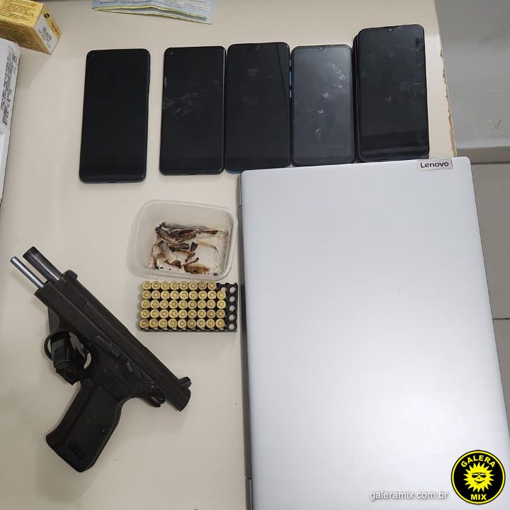Em busca no apartamento foram encontrados uma pistola 9mm e 44 munições, além de vários aparelhos telefônicos, um notebook e alguns cigarros de maconha.