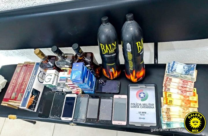 Em revista pessoal foi encontrado R$ 274. O outro envolvido, identificado apenas como E.T.F, de 22 anos, possuía dois mandados de prisão em seu desfavor por roubo e porte ilegal de arma de fogo. Ele estava com R$ 580. Em cima da mesa de uma residência estava todo o material proveniente do crime, sendo 8 aparelhos de telefone celular, 3 garrafas de bebida alcoólica e 62 maços de cigarro.